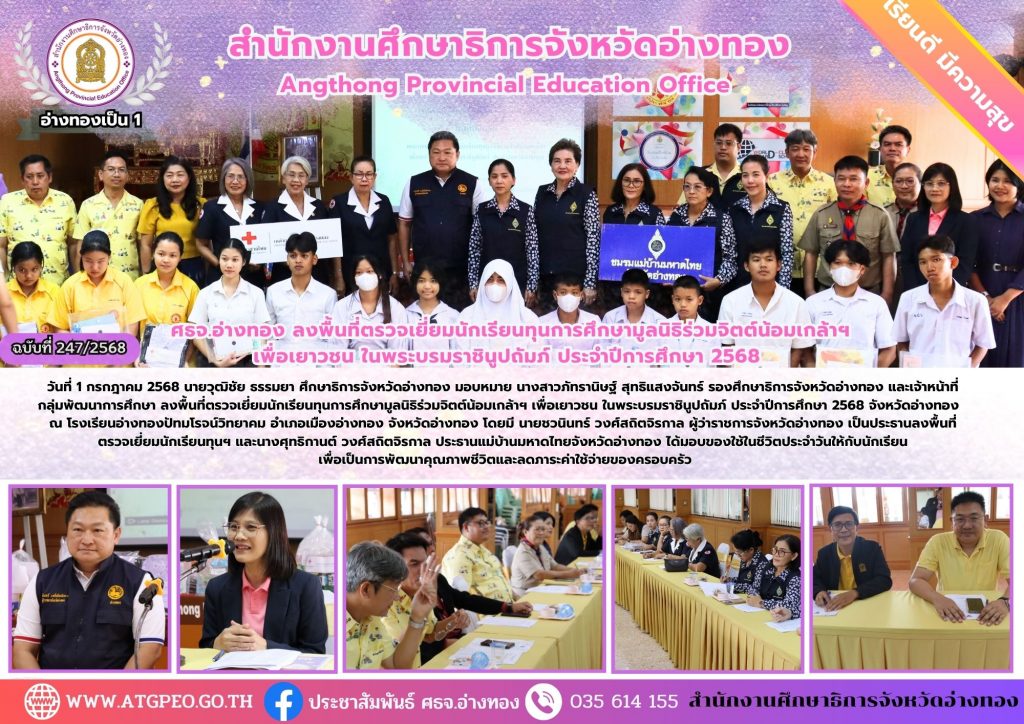 วันที่ 1 กรกฎาคม 2568 นายวุฒิชัย ธรรมยา ศึกษาธิการจังหวัดอ่างทอง มอบหมาย นางสาวภัทรานิษฐ์ สุทธิแสงจันทร์ รองศึกษาธิการจังหวัดอ่างทอง และเจ้าหน้าที่กลุ่มพัฒนาการศึกษา ลงพื้นที่ตรวจเยี่ยมนักเรียนทุนการศึกษามูลนิธิร่วมจิตต์น้อมเกล้าฯ เพื่อเยาวชน ในพระบรมราชินูปถัมภ์ ประจำปีการศึกษา 2568 จังหวัดอ่างทอง ณ โรงเรียนอ่างทองปัทมโรจน์วิทยาคม อำเภอเมืองอ่างทอง จังหวัดอ่างทอง โดยมี นายชวนินทร์ วงศ์สถิตจิรกาล ผู้ว่าราชการจังหวัดอ่างทอง เป็นประธานลงพื้นที่ตรวจเยี่ยมนักเรียนทุนฯ และนางศุทธิกานต์ วงศ์สถิตจิรกาล ประธานแม่บ้านมหาดไทยจังหวัดอ่างทอง ได้มอบของใช้ในชีวิตประจำวันให้กับนักเรียน เพื่อเป็นการพัฒนาคุณภาพชีวิตและลดภาระค่าใช้จ่ายของครอบครัว