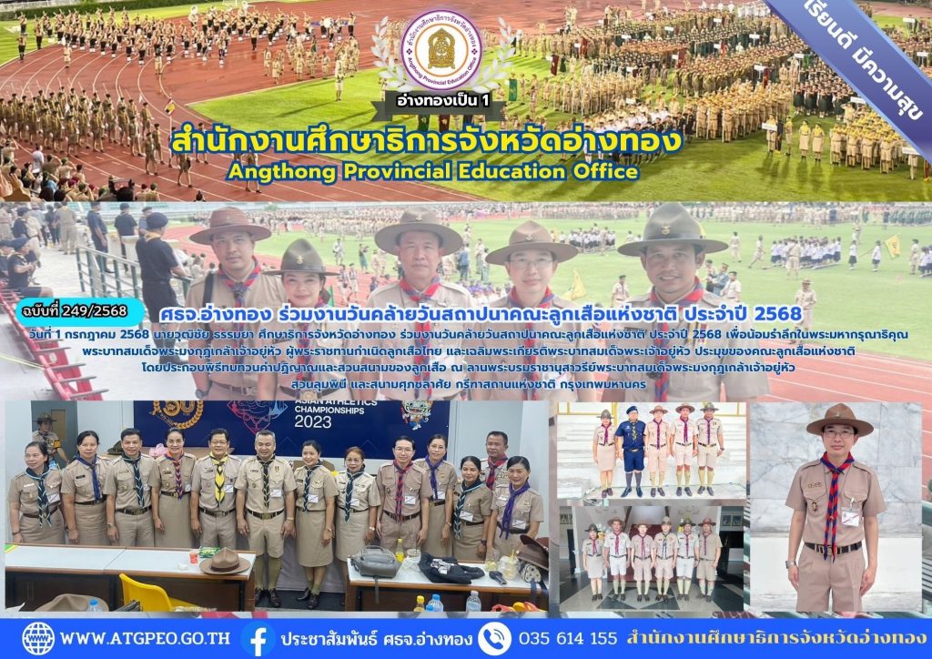 วันที่ 1 กรกฎาคม 2568 นายวุฒิชัย ธรรมยา ศึกษาธิการจังหวัดอ่างทอง ร่วมงานวันคล้ายวันสถาปนาคณะลูกเสือแห่งชาติ ประจำปี 2568 เพื่อน้อมรำลึกในพระมหากรุณาธิคุณพระบาทสมเด็จพระมงกุฎเกล้าเจ้าอยู่หัว ผู้พระราชทานกำเนิดลูกเสือไทย และเฉลิมพระเกียรติพระบาทสมเด็จพระเจ้าอยู่หัว ประมุขของคณะลูกเสือแห่งชาติ โดยประกอบพิธีทบทวนคำปฏิญาณและสวนสนามของลูกเสือ ณ ลานพระบรมราชานุสาวรีย์พระบาทสมเด็จพระมงกุฎเกล้าเจ้าอยู่หัว สวนลุมพินี และสนามศุภชลาศัย กรีฑาสถานแห่งชาติ กรุงเทพมหานคร