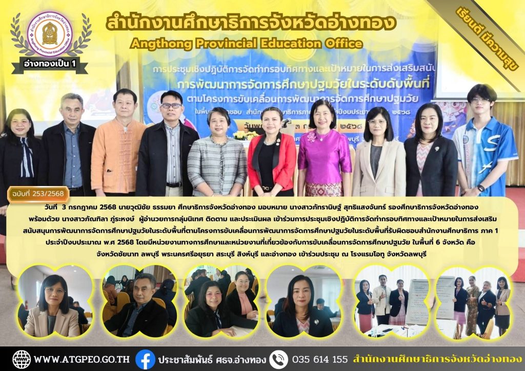 วันที่ 3 กรกฎาคม 2568 นายวุฒิชัย ธรรมยา ศึกษาธิการจังหวัดอ่างทอง มอบหมาย นางสาวภัทรานิษฐ์ สุทธิแสงจันทร์ รองศึกษาธิการจังหวัดอ่างทอง พร้อมด้วย นางสาวภัณฑิลา ภู่ระหงษ์ ผู้อำนวยการกลุ่มนิเทศ ติดตาม และประเมินผล เข้าร่วมการประชุมเชิงปฏิบัติการจัดทำกรอบทิศทางและเป้าหมายในการส่งเสริม สนับสนุนการพัฒนาการจัดการศึกษาปฐมวัยในระดับพื้นที่ตามโครงการขับเคลื่อนการพัฒนาการจัดการศึกษาปฐมวัยในระดับพื้นที่รับผิดชอบสำนักงานศึกษาธิการ ภาค 1 ประจำปีงบประมาณ พ.ศ 2568 โดยมีหน่วยงานทางการศึกษาและหน่วยงานที่เกี่ยวข้องกับการขับเคลื่อนการจัดการศึกษาปฐมวัย ในพื้นที่ 6 จังหวัด คือ จังหวัดชัยนาท ลพบุรี พระนครศรีอยุธยา สระบุรี สิงห์บุรี และอ่างทอง เข้าร่วมประชุม ณ โรงแรมโอทู จังหวัดลพบุรี