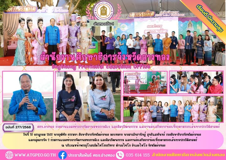 วันที่ 18 กรกฎาคม 2568 นายวุฒิชัย ธรรมยา ศึกษาธิการจังหวัดอ่างทอง มอบหมาย นางสาวภัทรานิษฐ์ สุทธิแสงจันทร์ รองศึกษาธิการจังหวัดอ่างทอง และกลุ่มภารกิจ 2 ร่วมงานแถลงข่าวการจัดงานมหกรรมลิเก และศิลปวัฒนธรรม และงานส่งเสริมการท่องเที่ยวตามรอยเส้นทางประวัติศาสตร์ ณ บริเวณหน้าพระอุโบสถวัดไชโยวรวิหาร ตำบลไชโย อำเภอไชโย จังหวัดอ่างทอง