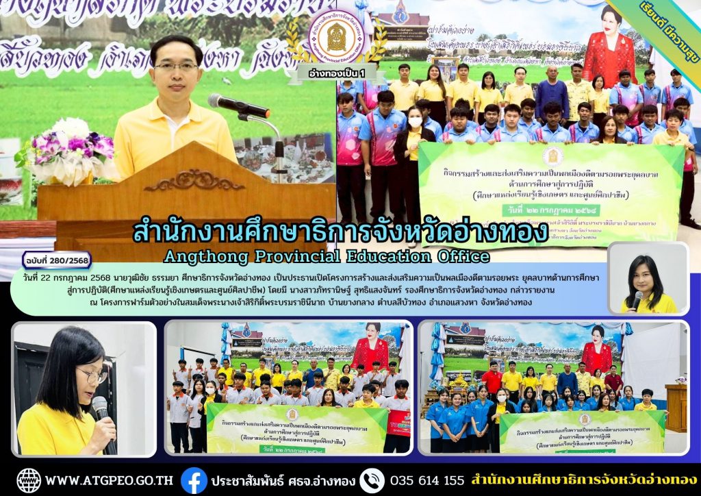 วันที่ 22 กรกฎาคม 2568 นายวุฒิชัย ธรรมยา ศึกษาธิการจังหวัดอ่างทอง เป็นประธานเปิดโครงการสร้างและส่งเสริมความเป็นพลเมืองดีตามรอยพระ ยุคลบาทด้านการศึกษาสู่การปฏิบัติ(ศึกษาแหล่งเรียนรู้เชิงเกษตรและศูนย์ศิลปาชีพ) โดยมี นางสาวภัทรานิษฐ์ สุทธิแสงจันทร์ รองศึกษาธิการจังหวัดอ่างทอง กล่าวรายงาน ณ โครงการฟาร์มตัวอย่างในสมเด็จพระนางเจ้าสิริกิติ์พระบรมราชินีนาถ บ้านยางกลาง ตำบลสีบัวทอง อำเภอแสวงหา จังหวัดอ่างทอง
