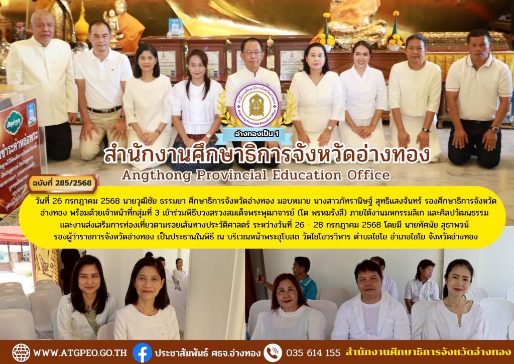 วันที่ 26 กรกฎาคม 2568 นายวุฒิชัย ธรรมยา ศึกษาธิการจังหวัดอ่างทอง มอบหมาย นางสาวภัทรานิษฐ์ สุทธิแสงจันทร์ รองศึกษาธิการจังหวัดอ่างทอง พร้อมด้วยเจ้าหน้าที่กลุ่มที่ 3 เข้าร่วมพิธีบวงสรวงสมเด็จพระพุฒาจารย์ (โต พรหมรังสี) ภายใต้งานมหกรรมลิเก และศิลปวัฒนธรรม และงานส่งเสริมการท่องเที่ยวตามรอยเส้นทางประวัติศาสตร์ ระหว่างวันที่ 26 – 28 กรกฎาคม 2568 โดยมี นายทัศนัย สุธาพจน์ รองผู้ว่าราชการจังหวัดอ่างทอง เป็นประธานในพิธี ณ บริเวณหน้าพระอุโบสถ วัดไชโยวรวิหาร ตำบลไชโย อำเภอไชโย จังหวัดอ่างทอง
