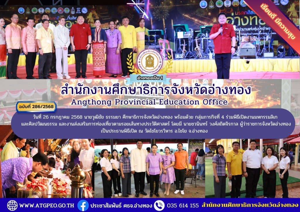 วันที่ 26 กรกฎาคม 2568 นายวุฒิชัย ธรรมยา ศึกษาธิการจังหวัดอ่างทอง พร้อมด้วย กลุ่มภารกิจที่ 4 ร่วมพิธีเปิดงานมหกรรมลิเก และศิลปวัฒนธรรม และงานส่งเสริมการท่องเที่ยวตามรอยเส้นทางประวัติศาสตร์ โดยมี นายชวนินทร์ วงศ์สถิตจิรกาล ผู้ว่าราชการจังหวัดอ่างทอง เป็นประธานพิธีเปิด ณ วัดไชโยวรวิหาร อ.ไชโย จ.อ่างทอง