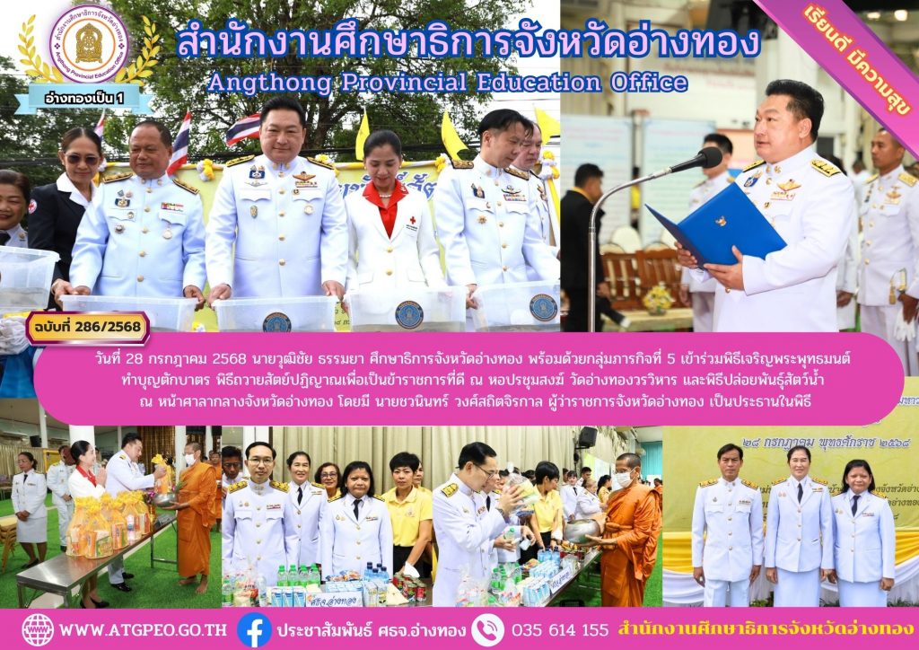 วันที่ 28 กรกฎาคม 2568 นายวุฒิชัย ธรรมยา ศึกษาธิการจังหวัดอ่างทอง พร้อมด้วยกลุ่มภารกิจที่ 5 เข้าร่วมพิธีเจริญพระพุทธมนต์ ทำบุญตักบาตร พิธีถวายสัตย์ปฏิญาณเพื่อเป็นข้าราชการที่ดี ณ หอปรชุมสงฆ์ วัดอ่างทองวรวิหาร และพิธีปล่อยพันธ์ุสัตว์น้ำ ณ หน้าศาลากลางจังหวัดอ่างทอง โดยมี นายชวนินทร์ วงศ์สถิตจิรกาล ผู้ว่าราชการจังหวัดอ่างทอง เป็นประธานในพิธี
