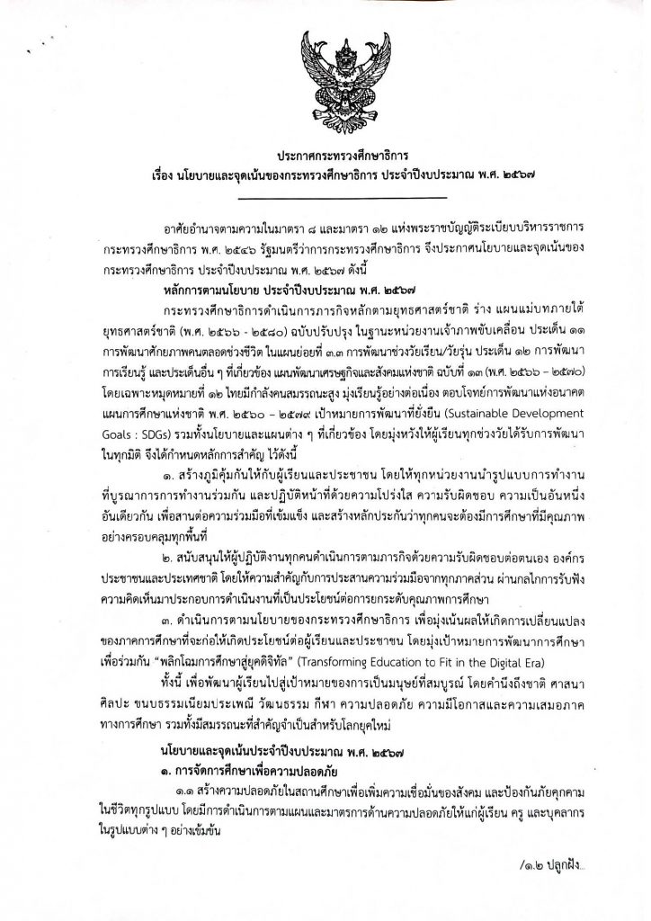 ประกาศนโยบายและจุดเน้นของกระทรวงศึกษาธิการ ปีงบประมาณ พ.ศ. 2567 23 มกราคม 256623 มกราคม 2023 atg peo แผนงาน / โครงการ / นโยบายประจำปี atg peo
