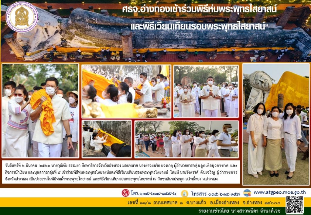 วันจันทร์ที่ 6 มีนาคม 2566 นายวุฒิชัย ธรรมยา ศึกษาธิการจังหวัดอ่างทอง มอบหมาย นางสาวสมรัก ยวงเกตุ ผู้อำนวยการกลุ่มลูกเสือยุวกาชาด และกิจการนักเรียน และบุคลากรกลุ่มที่ 5 เข้าร่วมพิธีห่มพระพุทธไสยาสน์และพิธีเวียนเทียนรอบพระพุทธไสยาสน์ โดยมี นายรังสรรค์ ตันเจริญ ผู้ว่าราชการจังหวัดอ่างทอง เป็นประธานในพิธีห่มผ้าพระพุทธไสยาสน์ และพิธีเวียนเทียนรอบพระพุทธไสยาสน์ ณ วัดขุนอินทประมูล อ.โพธิ์ทอง จ.อ่างทอง
