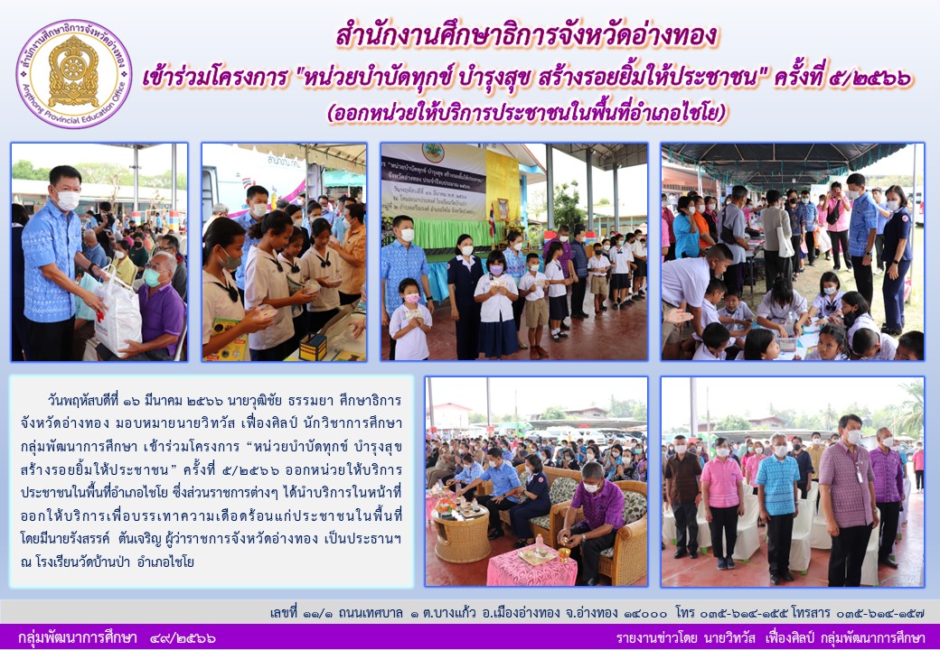 ศธจ.อ่างทอง เข้าร่วมโครงการ หน่วยบำบัดทุกข์ บำรุงสุข สร้างรอยยิ้มให้ประชาชน ครั้งที่ 5/2566 17 มีนาคม 256617 มีนาคม 2023 พนิดา จำนงค์เวช ภาพกิจกรรม ศธจ.อ่างทอง พนิดา จำนงค์เวช