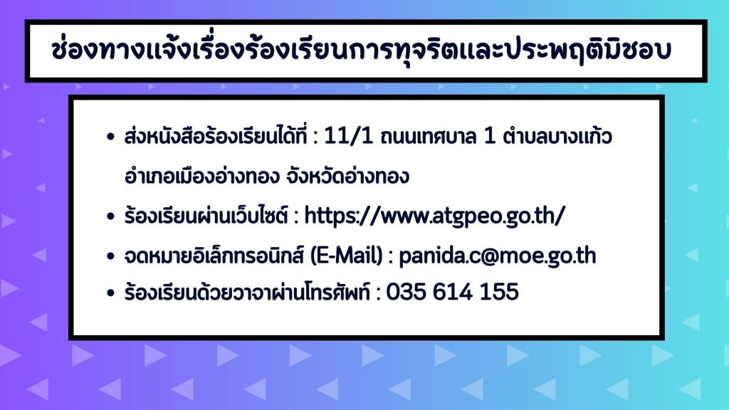 ช่องทางแจ้งเรื่องร้องเรียนการทุจริตและประพฤติมิชอบ 26 พฤษภาคม 256626 กรกฎาคม 2023 atg peo ITA ช่องทางรับเรื่องร้องเรียนการทุจริตและประพฤติมิชอบ คลิกที่แบรนเนอร์ด้านล่าง atg peo