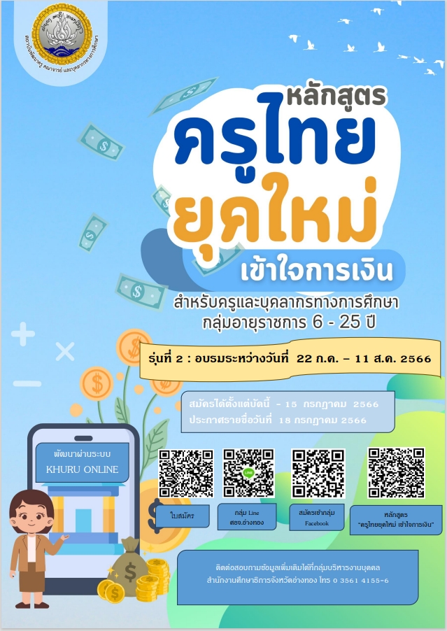 โครงการพัฒนาสมรรถนะครูและบุคลากรกระทรวงศึกษาธิการ หลักสูตร “ครูไทยยุคใหม่ เข้าใจการเงิน” รุ่นที่ 2 10 กรกฎาคม 256610 กรกฎาคม 2023 สิรานี ประชาสัมพันธ์ทั่วไป โครงการพัฒนาสมรรถนะครูและบุคลากรกระทรวงศึกษาธิการ เพื่อเสริมสร้างความยั่งยืนทางการเงิน ประจำปีงบประมาณ พ.ศ. 2566 หลักสูตร “ครูไทยยุคใหม่ เข้าใจการเงิน” รุ่นที่ 2 สิรานี